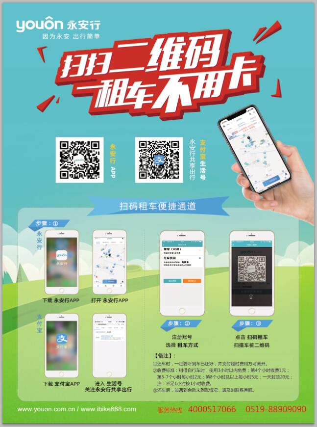 扫扫二维码,租车不用卡—淮安市民可通过“永安行app、支付宝”两种方式进行扫码骑行公共自行车!方便、快捷!