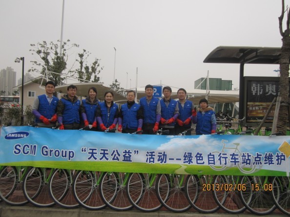 在活动现场有些自行车需要调整零件的,懂自行车维护的同志就自告奋勇的站出来担当这个任务,有些自行车需要清洁工作的,就拿起抹布认真仔细地擦试,不一会儿工夫一个又一个站点在他们熟练的动作中形成一道道美丽的风景线。三星显示器有限公司率先从自身做起,将环保理念深入员工带动市民,以实际行动支持环保事业。